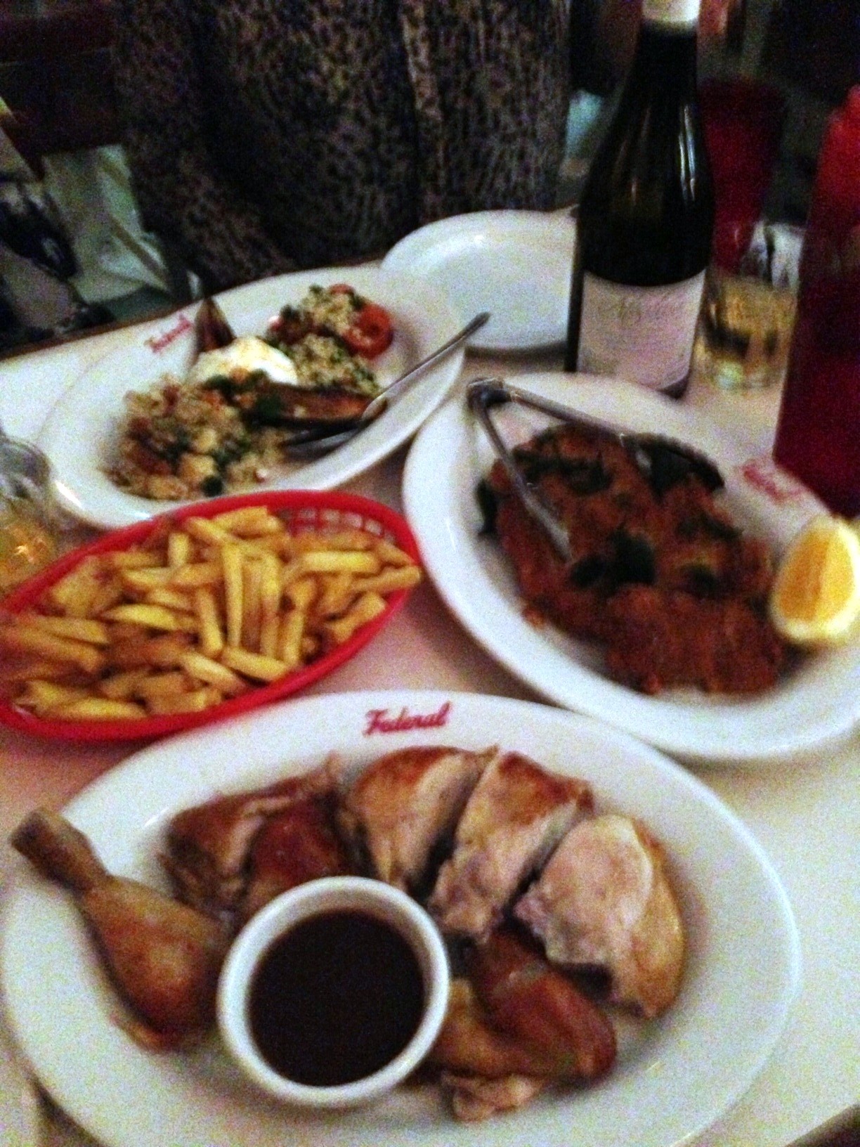 For mains we shared SPIT-ROAST CHICKEN (half bird) and VEAL SCHNITZEL (w/ sage & lemon) – again enough for 4. The schnitzel was the best I’ve tasted. And the water kept coming!!